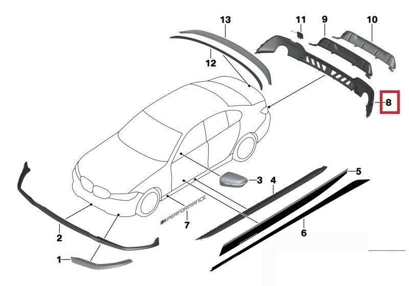 Please place the order only if you are completely confident that this part number is the right one for you and your car – always check the manufacturer part number prior to your purchase! Please note compatibility and part number issues – if you are unsure of your decision – we are here to help. FOR SALE IS A NEW BMW GENUINE 3 SERIES G20 G21 REAR BUMPER TRIM M PERFORMANCE – HIGH GLOSS BLACK WITHOUT CENTER DIFFUSER.FOR SALE IS TO FIT: – BMW 3 SERIES G20 G21 (2018 – 2020) .- M PERFORMANCE REAR TRIM WITH HIGH GLOSS BLACK FINISH, ONLY FIT FOR G20 G21 3 SERIES THAT COMES WITH M SPORT REAR BUMPER. WILL NOT FIT TO STANDART / STOCK BUMPER. THIS REAR TRIM COME WITHOUT CENTER DIFFUSER THE PART IS NUMBER NO. 9. PART NUMBER: 51192455856 Brand: BMW