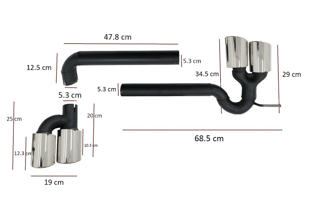 Intro The exhaust system is meant to facilitate the conversion to twin double muffler tips. You will get the quad S3 look on your A3 8V. Design S3 Description Complete Exhaust System Sport Design Crafted in high quality steel equipped High quality stainless steel muffler tips. Fitting and Installation Fitting instructions not included. Installation in an authorized car service is highly recommended! Package Contains: Exhaust System Package dimensions: Height (cm): 18 Width (cm): 44 Length (cm): 98 Weight (kg): 6.50 Certificates Product without E-mark/ABE/TUV. These are high quality aftermarket parts. Not suitable for: Audi A3 8V Hatchback / Sportback / Coupe (2012-2019) Audi with double exhaust (left&right) Audi with single left exhaust