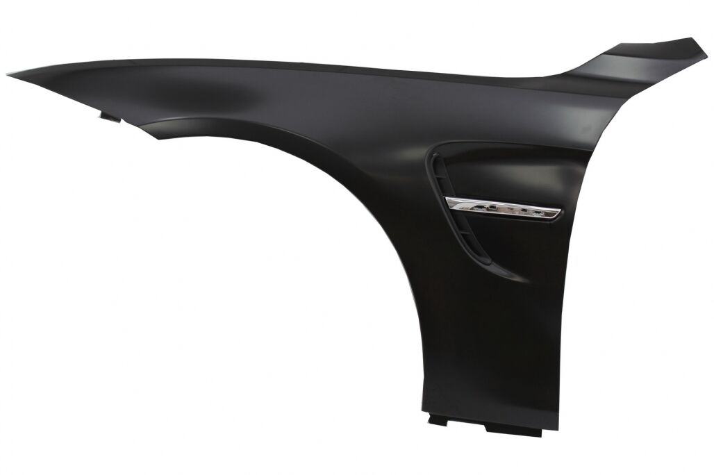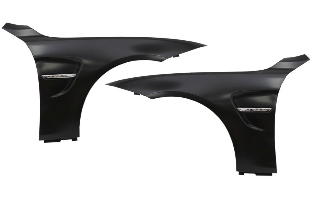 Intro These fenders are meant to give your BMW a M4 Look. Design M4 Description Front Fenders M4 Design Front fender equipped with crhome duct vents. Fenders are crafted in high quality metal and polypropylene. Color: Chrome Fenders are designed to retain factory wheel well spacing. (No wheel spacing modification needed.) Emblem not included the original one can be used. Fitting and Installation Fitting instructions not included. Installation in an authorized car service is highly recommended. Package Contains: One set front fendersReference number OE part number (comparative purpose)41357438441, 41357438442 Certificates Product without E-mark/ABE/TUV. These are high quality aftermarket parts. Not suitable for: BMW 4 Series F32 F33 F36 M4 Genuine (F82 / F83 M4)