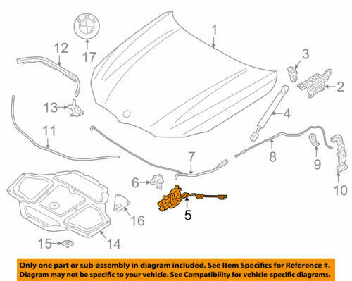 Please place the order only if you are completely confident that this part number is the right one for you and your car – always check the manufacturer part number prior to your purchase! Please note compatibility and part number issues – if you are unsure of your decision – we are here to help. NEW GENUINE BMW NEW GENUINE BMW G30 G32 GT G11 G15 G29 FRONT HOOD LOCK LEFT N/S 51237347404 TO FIT: – 5 SERIES G30/G31 (2016 – ) – 6 SERIES G32 GT (2017 – ) – 7 SERIES G11/G12 (2015 – ) – 8 SERIES G14/G15/G16 (2018 – ) – Z4 G29 (2018 – ) PART NUMBER: 51237347404 Brand: BMW