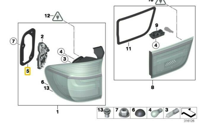 Please place the order only if you are completely confident that this part number is the right one for you and your car – always check the manufacturer part number prior to your purchase! Please note compatibility and part number issues – if you are unsure of your decision – we are here to help. NEW OEM BMW X5 SERIES E70 LCI REAR LIGHT SIDE PANEL RIGHT GASKET SEAL O/S FIT: – BMW X5 SERIES E70 LCI (2009 – 2013) NOTE:- PART FITS ONLY LCI MODEL. – IN THE PICTURE PART IS MARKED AS NO. 5 Part number:63217262578 Brand: BMW
