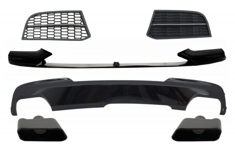 Old Description This Conversion Kit is meant to add a sporty touch on your BMW M-Technik and to transform it in a M-Performance Sport M550 Design Design M-Performance Sport M550 Description Front Bumper Spoiler Lip M-Performance Design Color: Shiny Black Front Bumper Spoiler is crafted in high quality polypropylene The spoiler does not requires painting Side Grilles M-Performance M Sport M550 Design Material: made of high quality ABS plastic, not fiberglass! Color: Black with dark anthracite silver stripe OEM quality with excellent fit! Note: As with the original M 550, the grille on the driver’s side is closed! Double Outlet Air Diffuser 550i Design Brilliant Black Edition Double Outlet Air Diffuser is crafted in high quality polypropylene Colour: Piano Black The diffuser does not require painting Exhaust Muffler Tips BMW 5 Series LCI Square Design Black Muffler Tips Exhaust are crafted in high quality 304 stainless steel Design: LCI Square Dimensions: Diameter: 60mm Length: 160mm Width: 185mm Fitting and Installation For cars with fog lights, these can be coded out! Fog lights canceller not included! Fitting instructions not included. Installation in an authorized car service is highly recommended. The exhaust mufflet tips must be welded on the original exhaust system. Package Contains: Front Bumper Spoiler Side Grilles (left&right) Air Diffuser One set exhaust muffler tips (left+right) Certificates Product without E-mark/ABE/TUV. These are high quality aftermarket parts. Not suitable for: BMW 5 Series F10 (2011-2017) equipped with standard package BMW 5 Series F11 (2011-2017) equipped with standard package