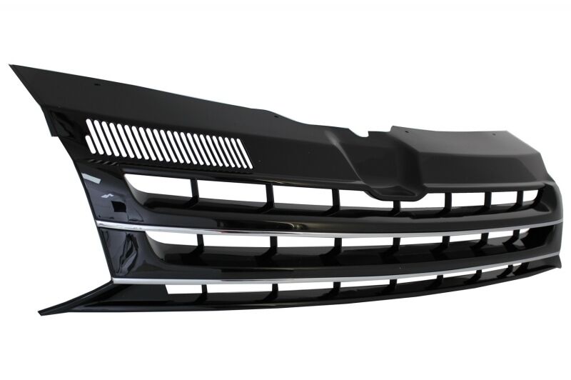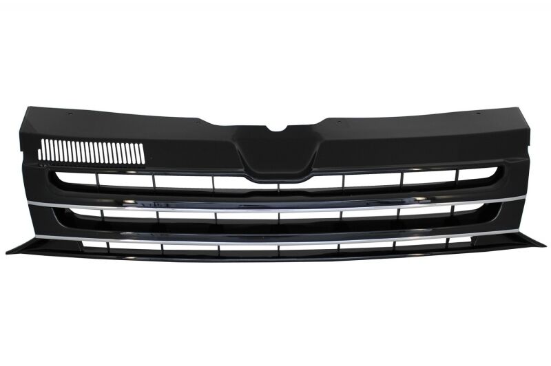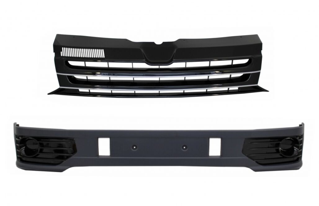 Intro This package is meant to add the sporty Sportline touch on your VW T5.1 Facelift. Design Sport Line Description Front Bumper Spoiler Extension Sportline Design Material: crafted in high quality ABS plastics The front bumper spoiler requires priming and painting. Add-on to the existing bumper with or without Fog Lights. You can use the old fog lights from existent bumper. *Fog Lights projectors not included Front Grille Black with Chrome Stripes Front Grille made of high quality ABS plastic Finish: Black with chrome stripes insertion Fitting and Installation Fitting instructions not included. Installation in an authorized car service is highly recommended. Package Contains: Front Bumper Spoiler Front Grille Certificates Product without E-mark/ABE/TUV. These are high quality aftermarket parts. Not suitable for: VW T5 Transporter Multivan Caravelle (2003-2009)