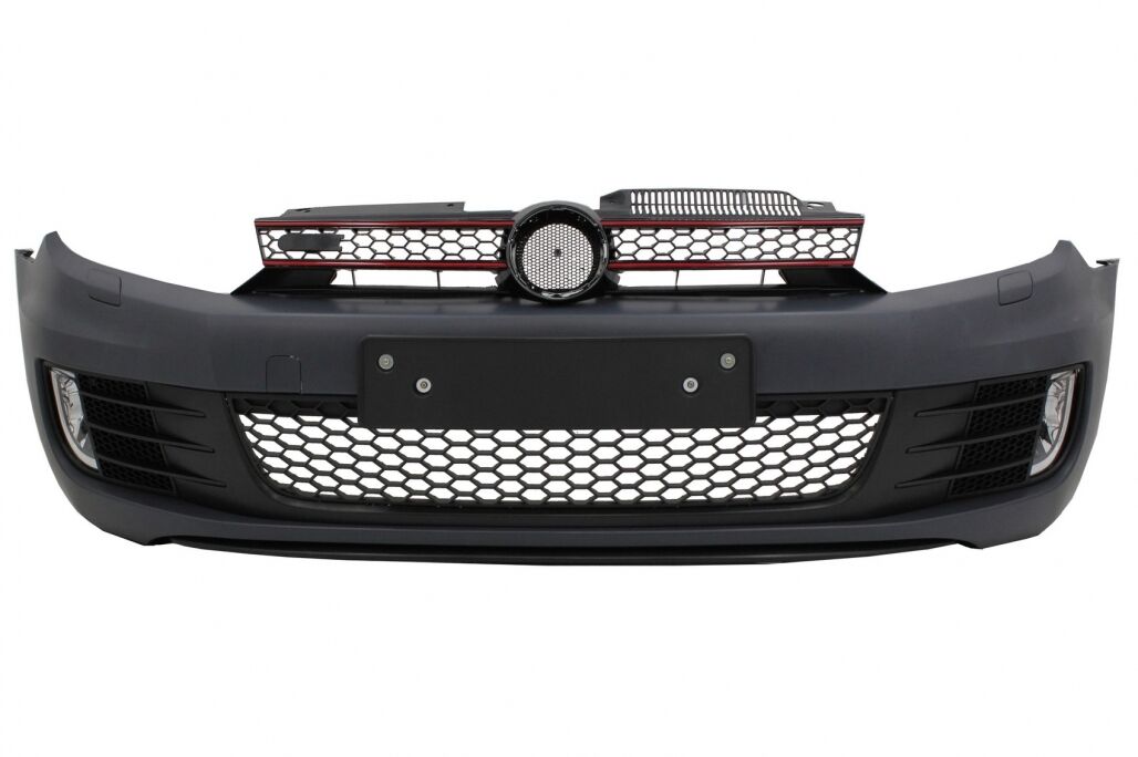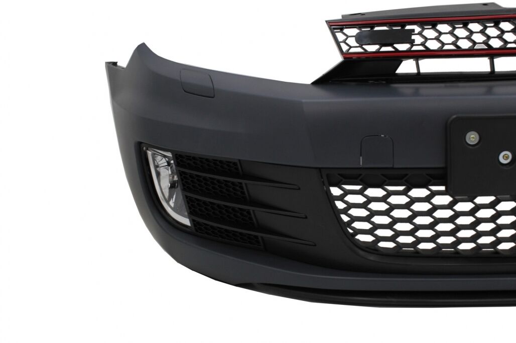 Intro This package is meant to add a sporty touch on your Volkswagen and transform it in a genuine GTI model. Design GTI Description Front Bumper made from high quality polypropylene, prepared for painting operation (primed) Equipped with honey comb front grille, central-lower grille, side grilles, fog light projectors and lower bumper extension. The bumper is not compatible with cars equipped with PDC For Golf VI models equipped with Headlights Washing System (SRA) the washing fluid tank must be replaced with genuine GTI washing fluid tank Also the headlights washers covers must be replaced with headlights washer covers for genuine GTI Front Bumper Add-On Spoiler Lip Material: Crafted in high-quality plastic Color: Piano Black Fitting and Installation Fitting instructions not included. Installation in an authorized car service is highly recommended. Package Contains: Front bumper Front bumper lower extension Central grille Fog lamps License plate support is not included. Genuine License plate support can be used. Front bumper lip extension spoiler (3 pcs) Screws Certificates Product without E-mark/ABE/TUV. These are high quality aftermarket parts. Not suitable for: VW Golf VI 6 MK6 R20 VW Golf VI 6 MK6 GTI/GTD Variant models