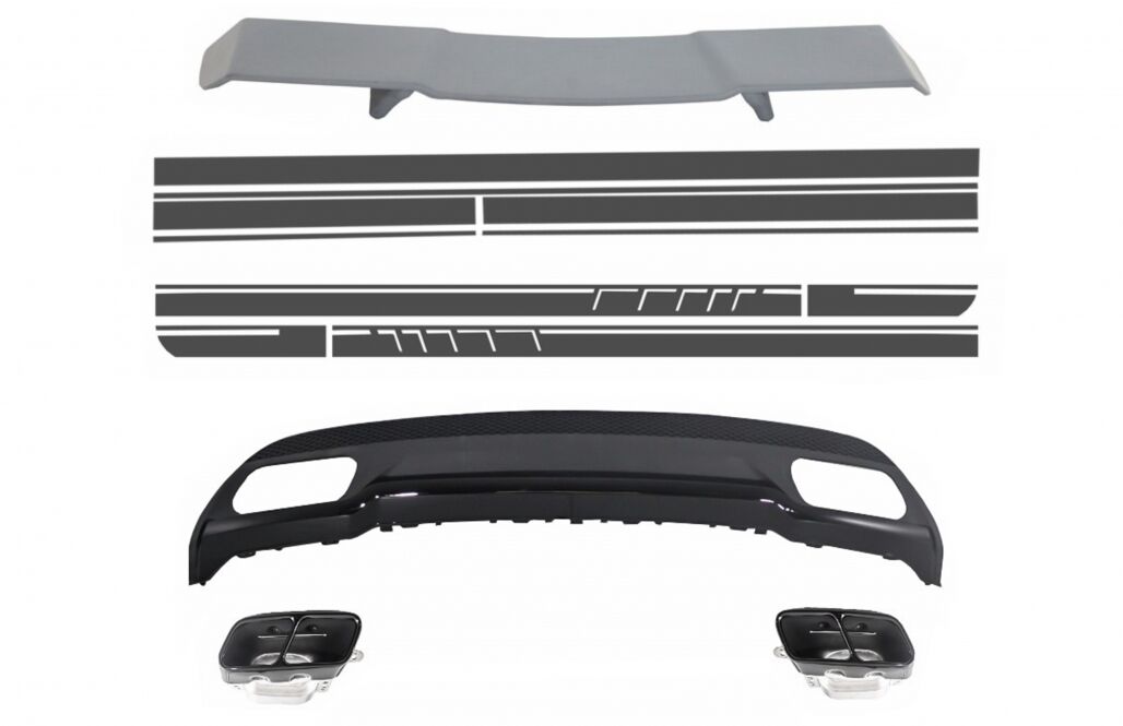 Old Description This package is made to give the aggressive look to your Sport Package Mercedes A-Class W176 Design A-Design Description Rear Bumper Air Diffuser crafted in high quality ABS plastic, equipped with double exhaust outlets Tailpipe 304 stainless steel muffler tips. Muffler Tips Finish: Shadow Black A45 A-Design Boot Lid spoiler is crafted in high quality polypropylene, The spoiler is treated for painting process (primed) Material: Transferable sticker Install need skills and patience and we highly recommend the mounting in a professional auto beauty shop. Streamlines should be applied to a cool surface with temperatures between 15 C and 27 C. Application area must be dry and thoroughly cleaned. Additional adjustment may be needed. The backing may be wrinkled due to the tubed package used for shipment – however this will not affect the decal in any way. Simply lay the decal flat on the ground and peel off the decal from the back when you apply it on the vehicle. Fitting and Installation Fitting instructions not included. Installation in an authorized car service is highly recommended. Package Contains: Double Square tailpipes Left and Right. Rear Bumper Diffuser with trims and insert Rear diffuser insert frame Boot Lid Spoiler One set of Side Decals Sticker Grey(Left&Right) One set of Decals Sticker Grey (Left&Right) Package dimensions: Length 1.46 cm Width 0.40 cm Height 0.20 cm Weight: 6kg Certificates Product without E-mark/ABE/TUV. These are high quality aftermarket parts. Not suitable for: Mercedes A-class W176 2012-up equipped with standard bumpers