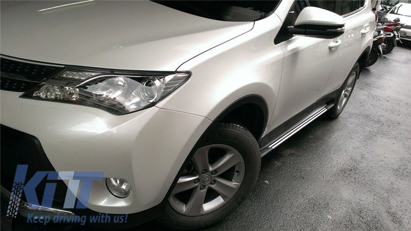 Intro Stylish and functional running boards ease your entry and exit while providing a rugged element of design. Grippy rubber studs dot the running boards, for a surer step even in inclement weather. Description Running boards are crafted in high quality 304 stainless steel, aluminum and PVC. Running boards are equipped with anti-slip rubber material. Color: Dusted White Fitting and Installation Fitting instructions not included. Installation in an authorized car service is highly recommended. Package Contains: One set of Running Boards (left & right) Fitting AccessoriesReference number OE part number (comparative purpose)PT925-42160, PT92542130, PT92542160 Package dimensions: Length: 1.82 m Width: 0.25 m Height: 0.17 m Weight: 10.5 kg Certificates Product without E-mark/ABE/TUV. These are high quality aftermarket parts. Not suitable for: Toyota RAV4 XA40 (2013-2018) Hybrid models Toyota RAV4 (2008-2012) Toyota RAV4 (2000-2008)
