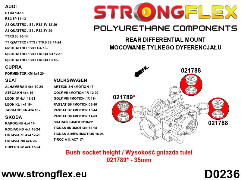 • The bush fits a differential with a 35mm high socket. If you have a differential with a 30mm high socket, choose bushings 021787.