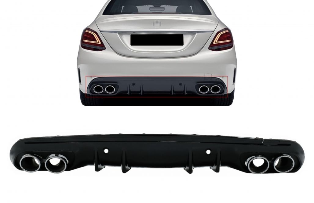 Only Saloon (sedan) and Wagon with AMG line / C43 / C63 bumper! 304 stainless steel muffler tips (2 pcs.) Chrome Diffuser: Piano Black Gloss * All Diesel Bluetec models with ADBLUE will require modification of one tailpipe to fit as the Adblue tank resides behind the tailpipe.