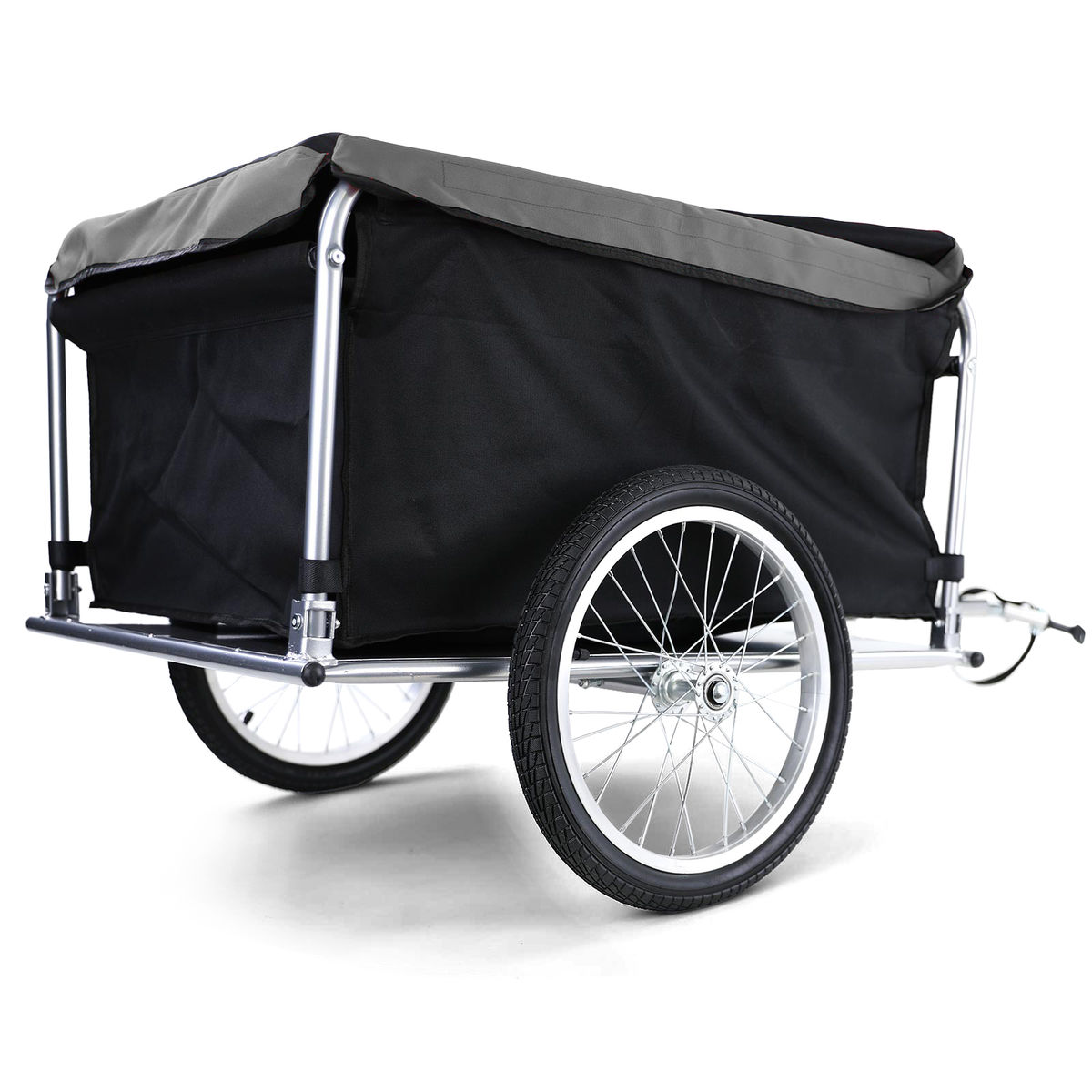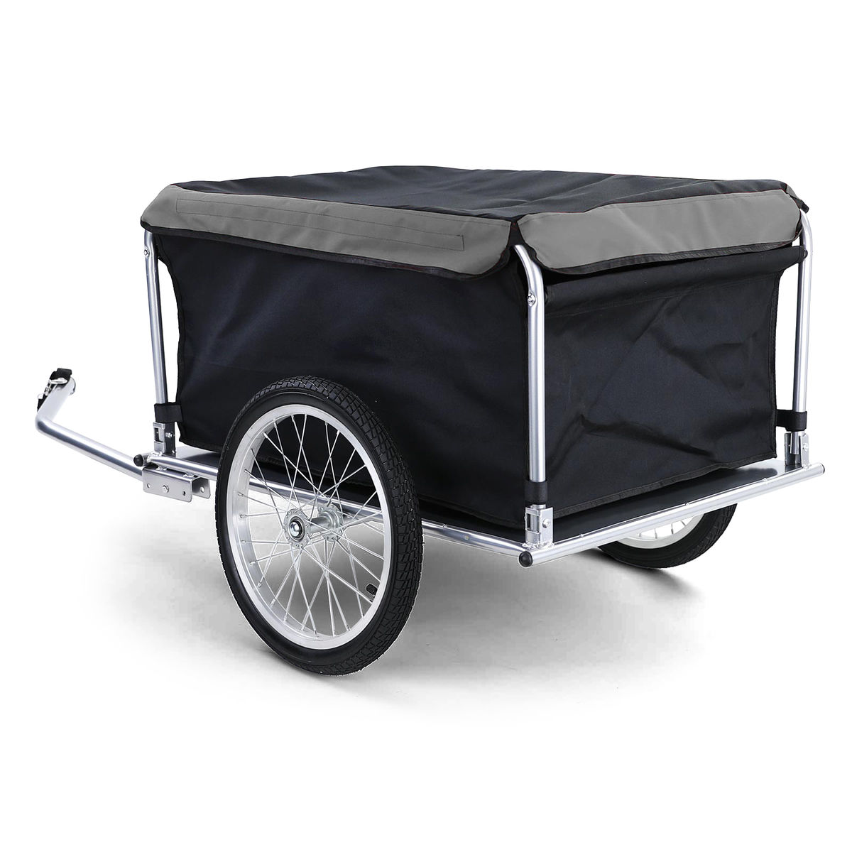 This versatile bike cargo trailer has a maximum load capacity of 65 kg. It is a perfect choice for local commutes or long-distance tours. This bike cargo trailer’s frame is made of steel which makes it very sturdy and durable. Thanks to 100% polyester fabric, the cargo compartment with included cover is water resistant. Meanwhile, it has a ball coupling design for quick attachment to the bike. The foldable drawbar and quick-release tyres make this trailer a real space-saver when it comes to storage as well as transportation. The high-visibility coloured reflectors are designed for extra safety. The cargo compartment is easily removable due to the hook and loop fasteners. Specifications: Color: Black and gray Frame Color: Gray Material: Steel, fabric (100% polyester) Overall size with drawbar: 136 x 72 x 58 cm (L x W x H) Cargo compartment dimensions: 72 x 55 x 36 cm (L x W x H) Maximum load capacity: 65 kg Weight: 10,8 kg Foldable drawbar Ball coupling design for quick attachment to the bike Removable cargo compartment With Colored reflectors for high visibility Including a removable, weather-resistant cover Hook and loop fasteners for quick removal of the fabric storage compartment